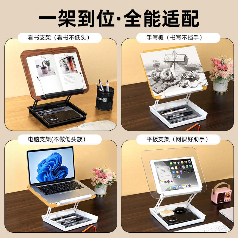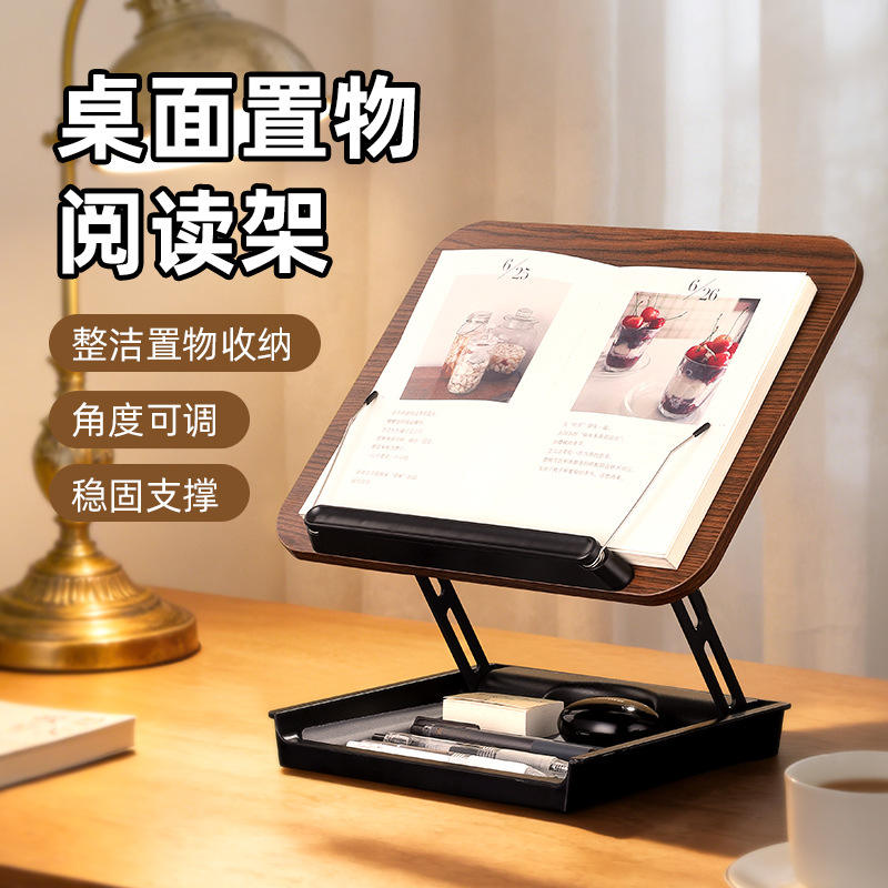 Adjustable Desktop Reading Stand With Storage Tray For Laptops Tablets Wood Finish Tripod Design No Installation Required