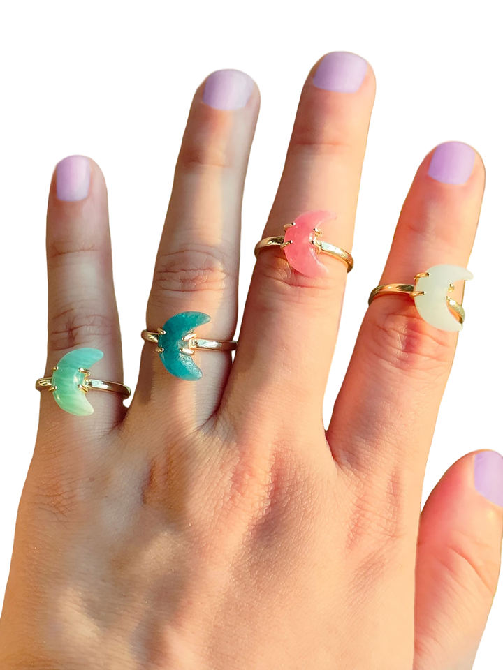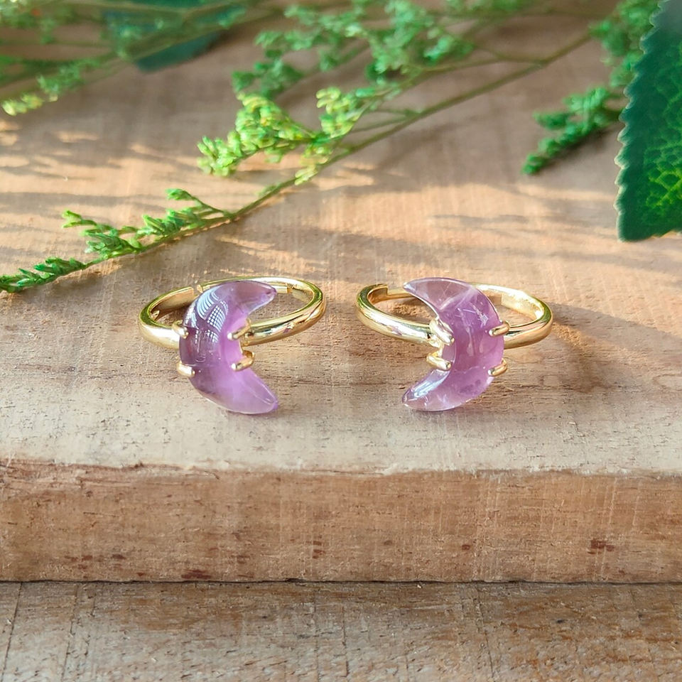 Adjustable Gold-Plated Brass Moon Ring with Amethyst Gemstone Healing Crystal Stone Sterling Silver Crescent Jewelry