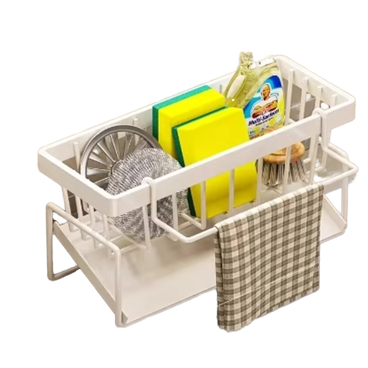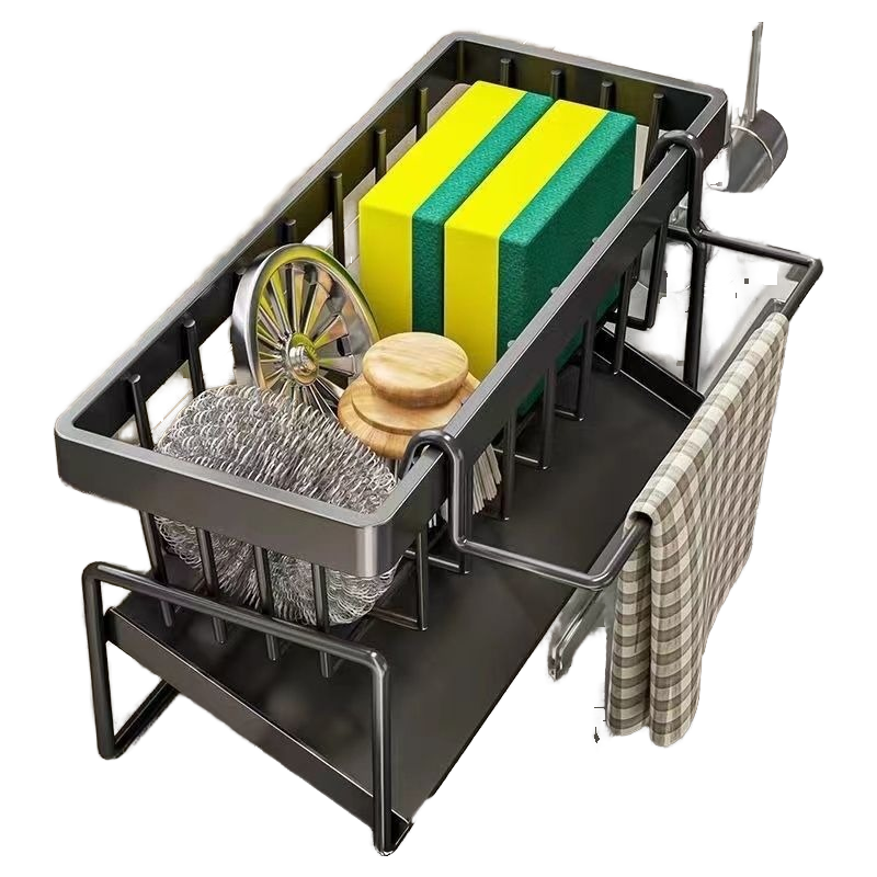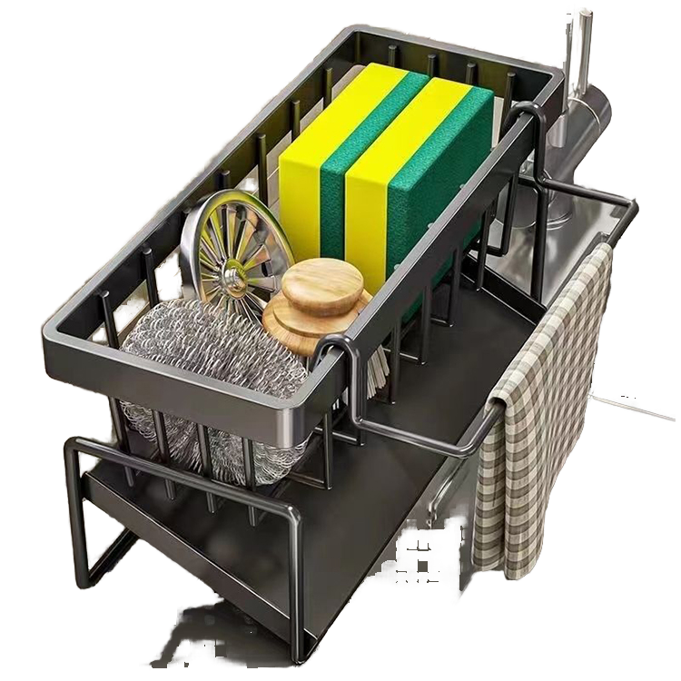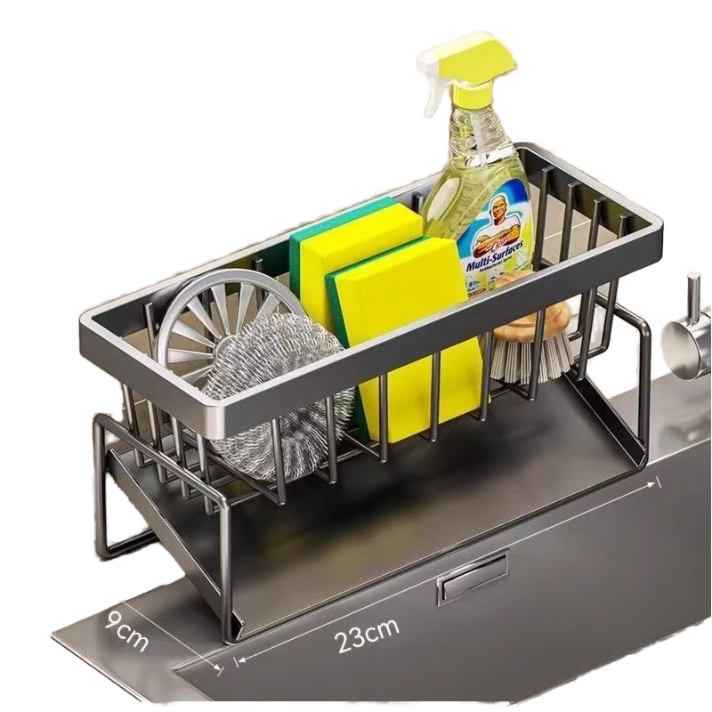 Adjustable Metal Kitchen Storage Rack-Dish Drainer with Utensil Holder Sponge Shelf & PP Plastic Base Sink Caddy Organizer