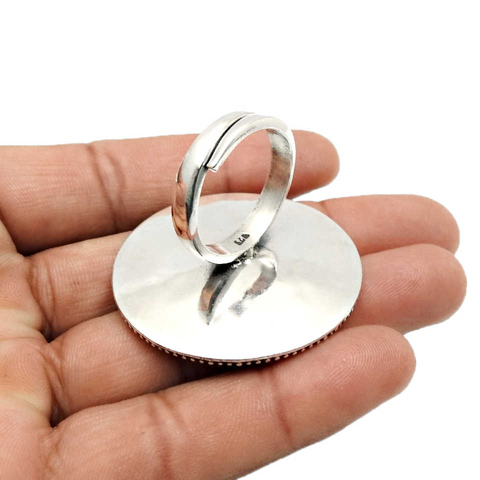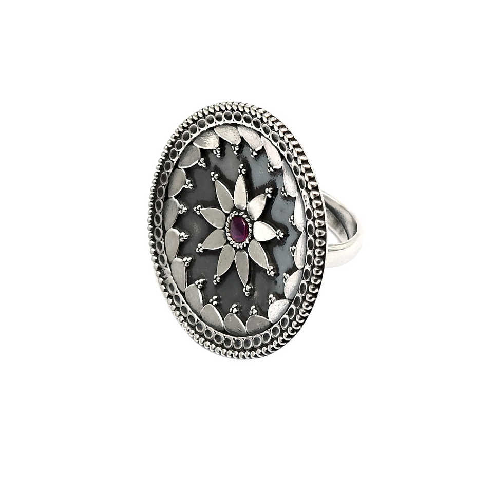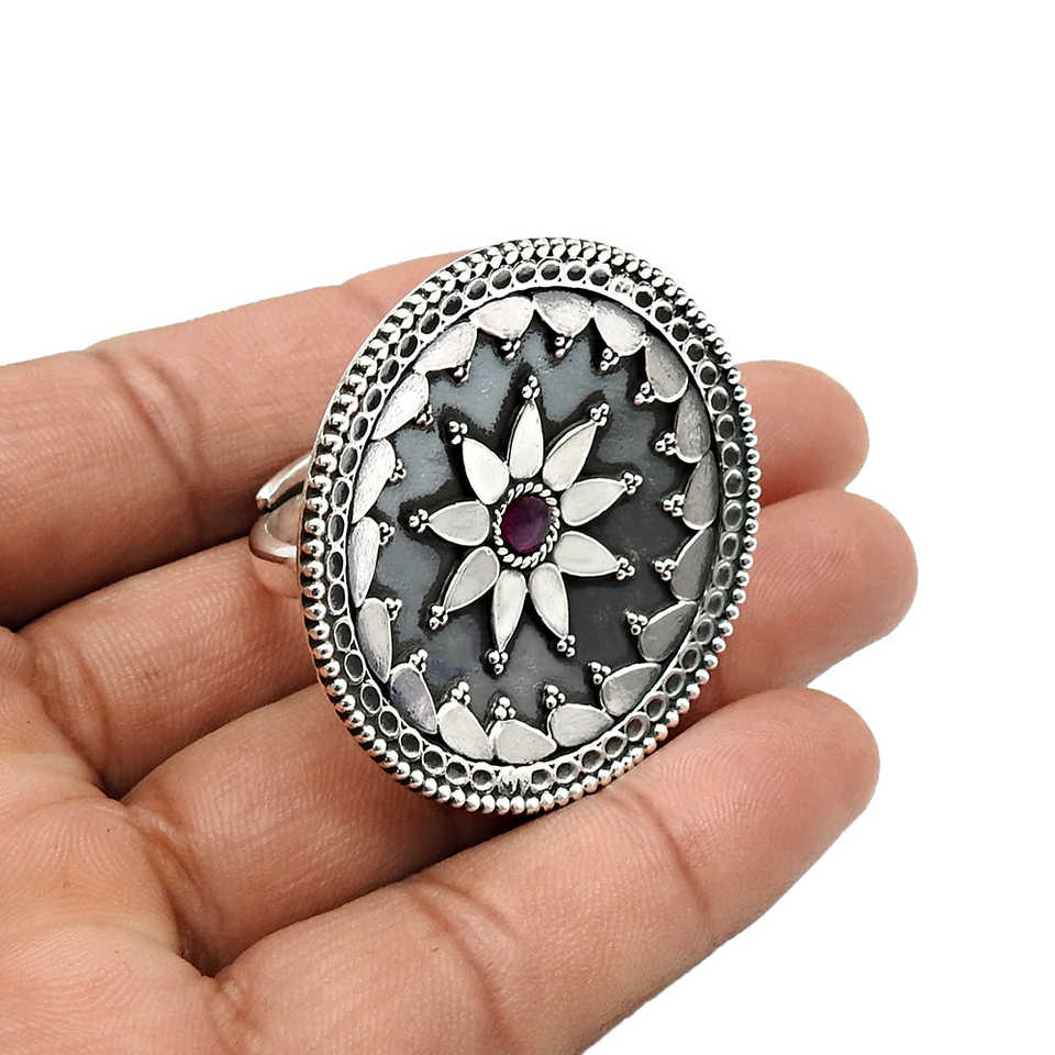 Adjustable Ring With Round Cut Ruby Gemstone Solid 925 Sterling Silver Handmade Bohemian Jewelry Flower Design Vintage Ring