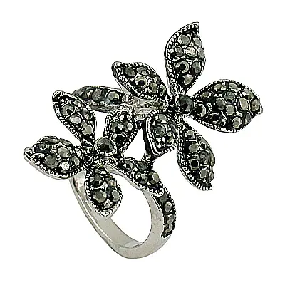 Adjustable Silver Flower Ring for Women Trendy Statement Jewelry with Black Gemstones Gold Plated Inlay Free Size