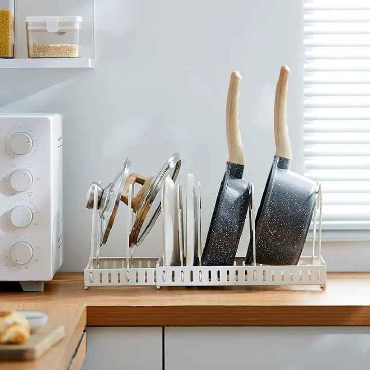 Adjustable White Metal Pot Lid Rack and Pan Organizer Expandable Kitchen Cabinet Storage Shelf for Frying Pans and Cookware