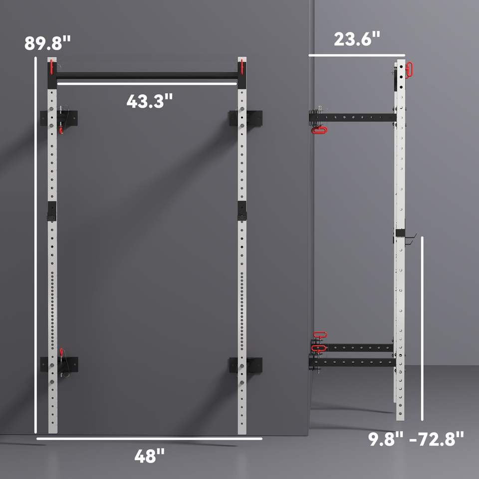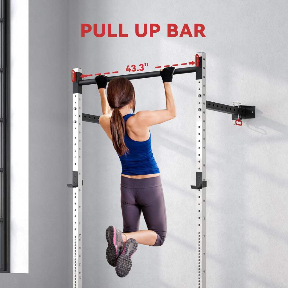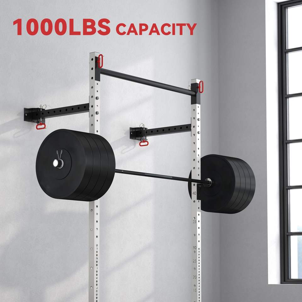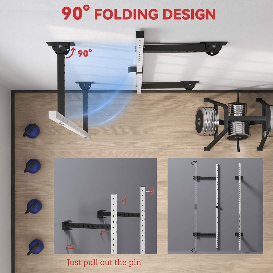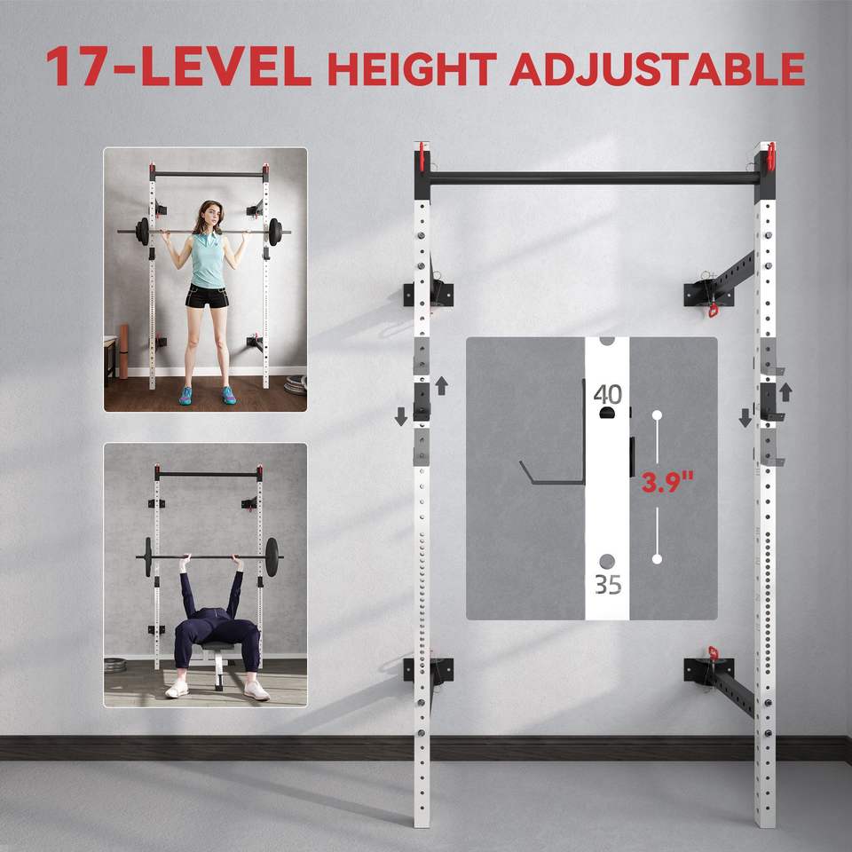 Adjustable White Power Rack Wall Mounted with Pull-Up Bar 1000 Pounds Capacity Folding Squat Bench