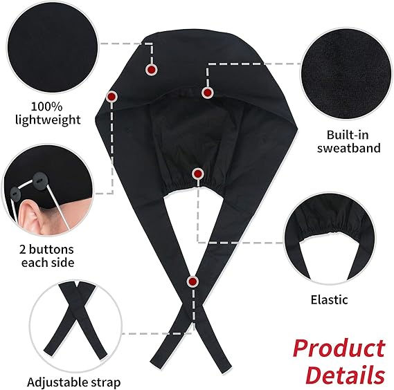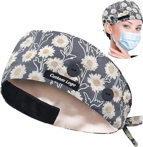 Adjustable Working Cap with Button, Satin-Lined Nursing Hat, Cotton Working Hat Sweatband, Elastic Tie Back Hats Unisex