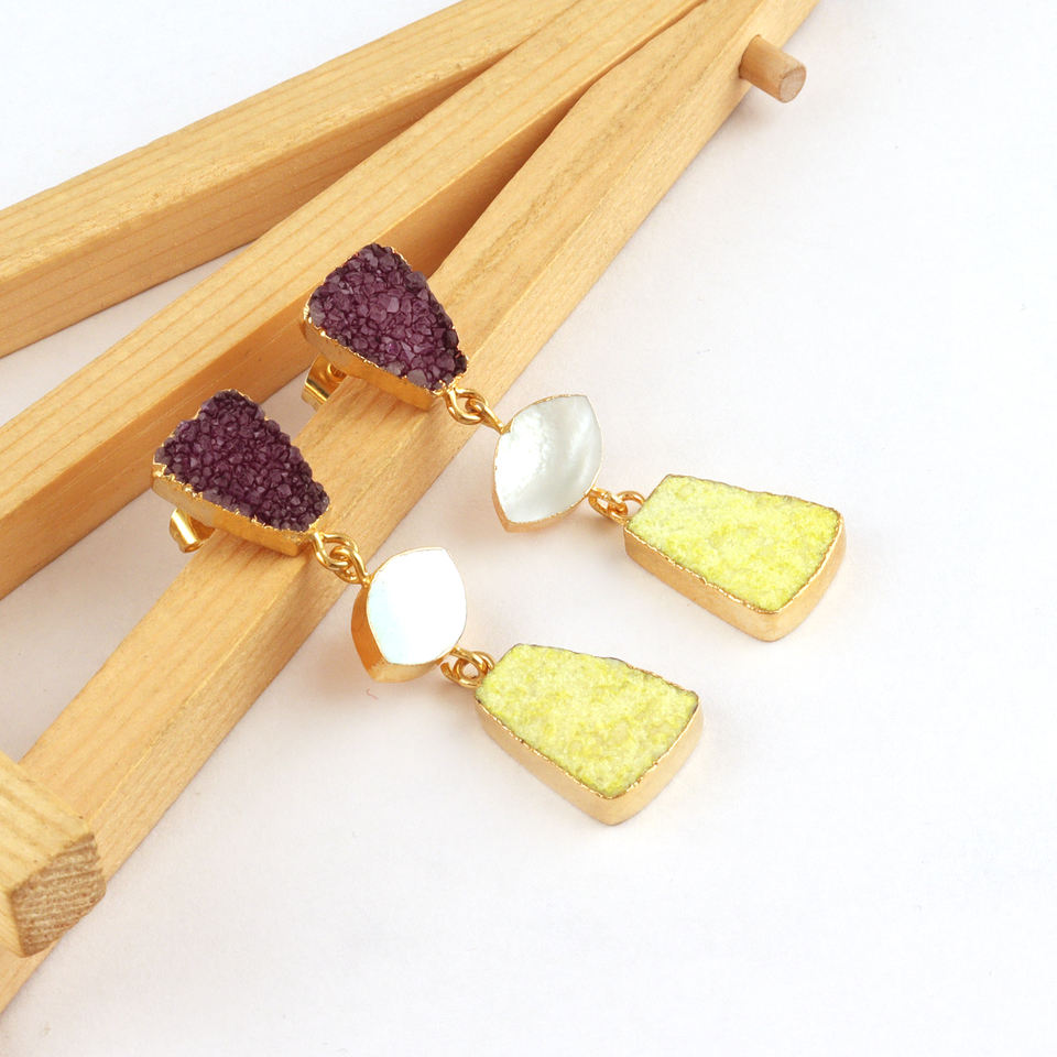 Adorable Look Natural Sugar Druzy & Mother of Pearl Triple Stone Earrings 24k Gold Electroplated Stud Dangle Earrings Jewelry
