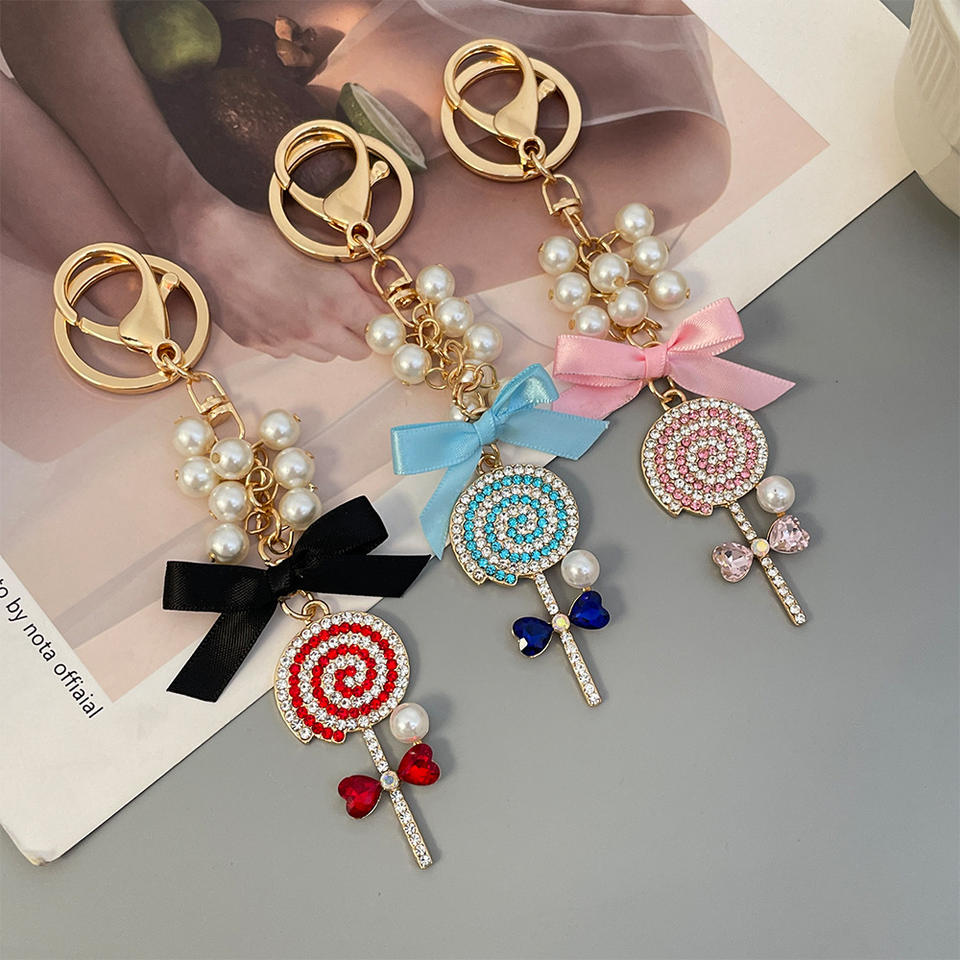 Adorable Pearl-Strung Lollipop Heart Alloy Car Keyring with Diamond-Studded Bow Bag Charm Vintage Cartoon Design for Women