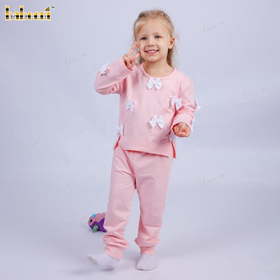 Adorable Girl Set with White Bows on the Body pink Two Yarn Fabric ODM OEM Wholesale Smocked Kids Clothing Girls Sets - BB4085