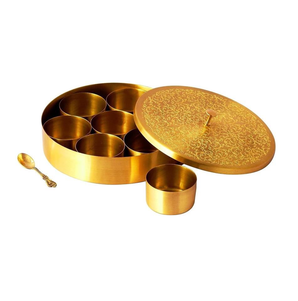 Advantageous Design Shiny Finished Brass Spice Box Handmade Shape Masala Box 7 Compartment Durable Eco-Friendly Home Kitchen Use