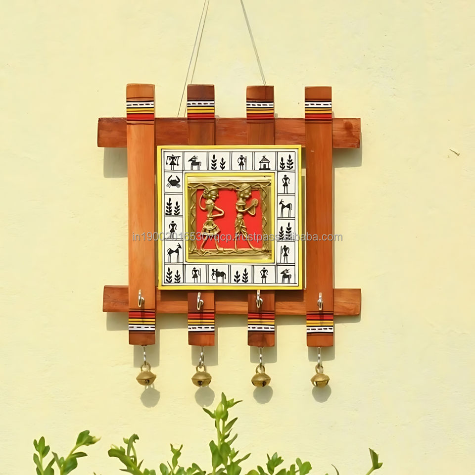 Aesthetic 9 Inch Square Brass Key Hanger Rustic Tribal Art Style Golden Finish Home Decoration Creative Table Decor Metal