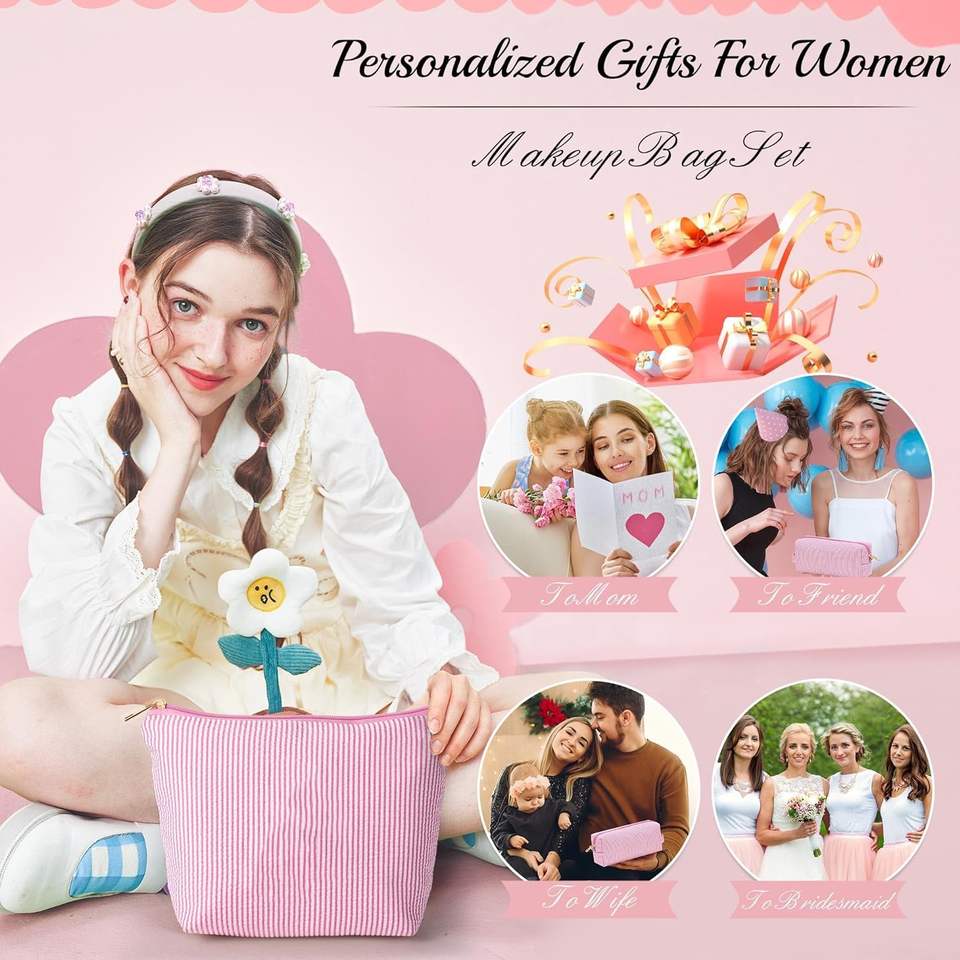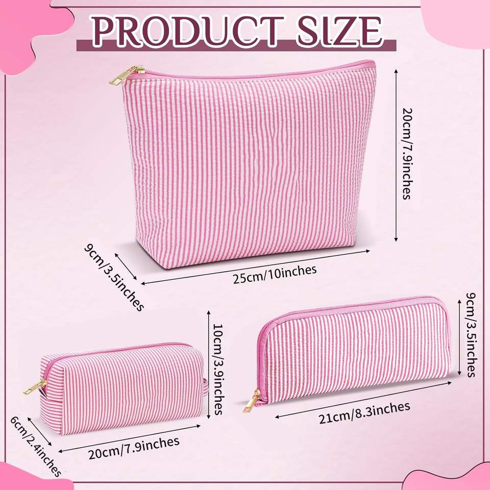 Aesthetic Cute Preppy Women's Seersucker Cosmetic Bag Zipper Small Makeup Purse Pouch Travel Toiletries Fashion Stripe Design