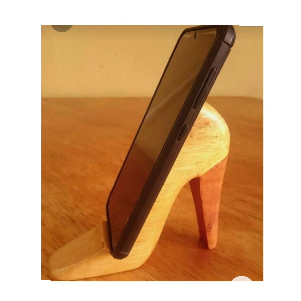 Aesthetic wooden mobile holder complement securely cradles smartphone allowing for hands free viewing while charging