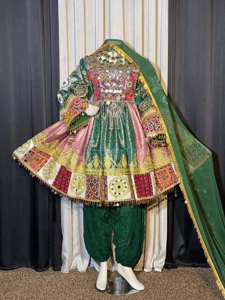 Afghan Traditional Attan Dress With Heavy Hand Embroidery Green Pink Combination And Colorful Patchwork Border With Detailed