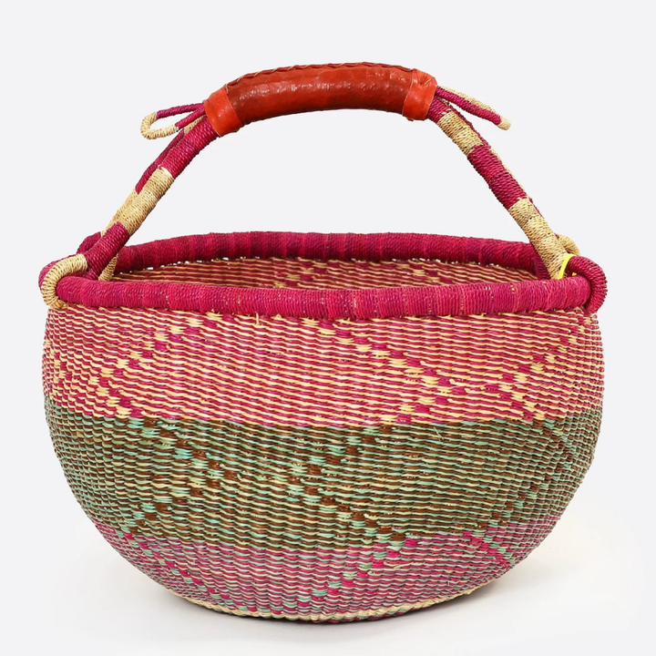 African Handmade Bolga Basket with Leather Wrapped Handle for Decorative Storage and Stylish Market Carry