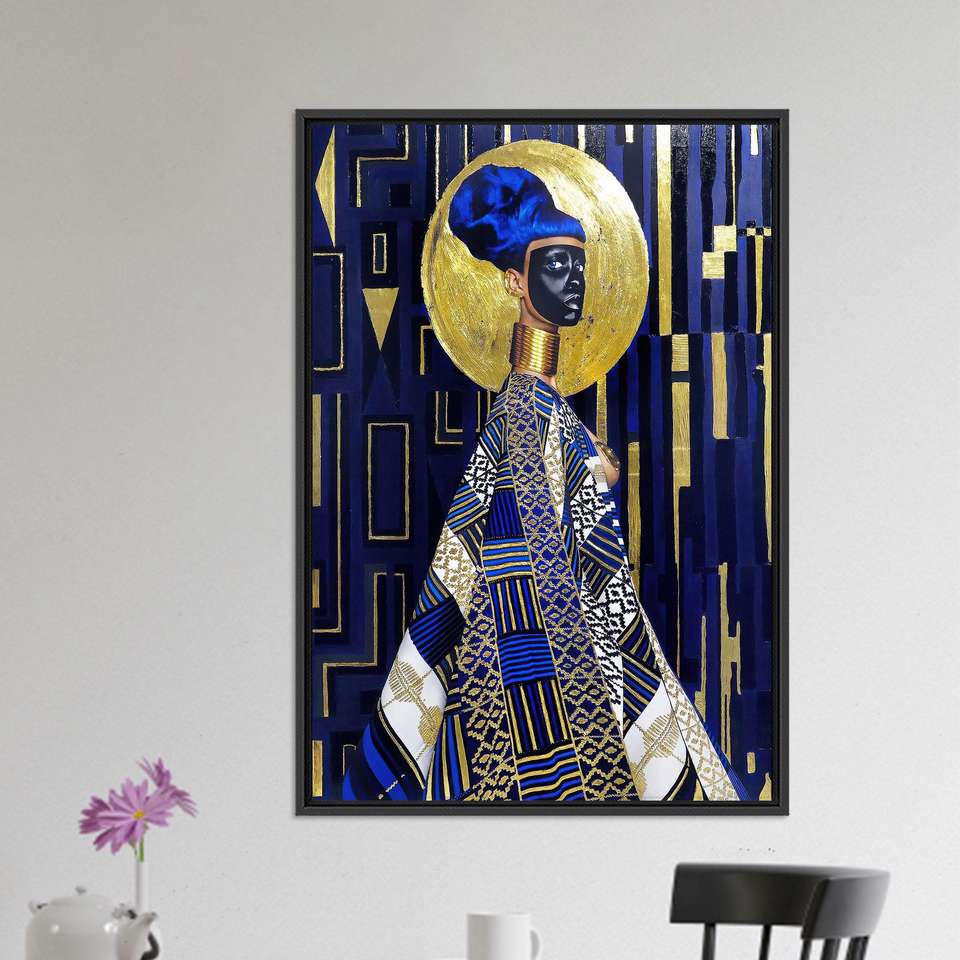 African Royal Woman Canvas Art: Blue & Gold Glam Decor Print,BLACK FRAMED CANVAS