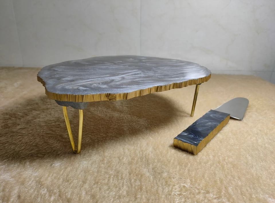 Agate Look Grey Resin and Metal Tripod Cake Stand Elegant Round Dessert Display Stand with Three-Leg Design for Parties, Wedding