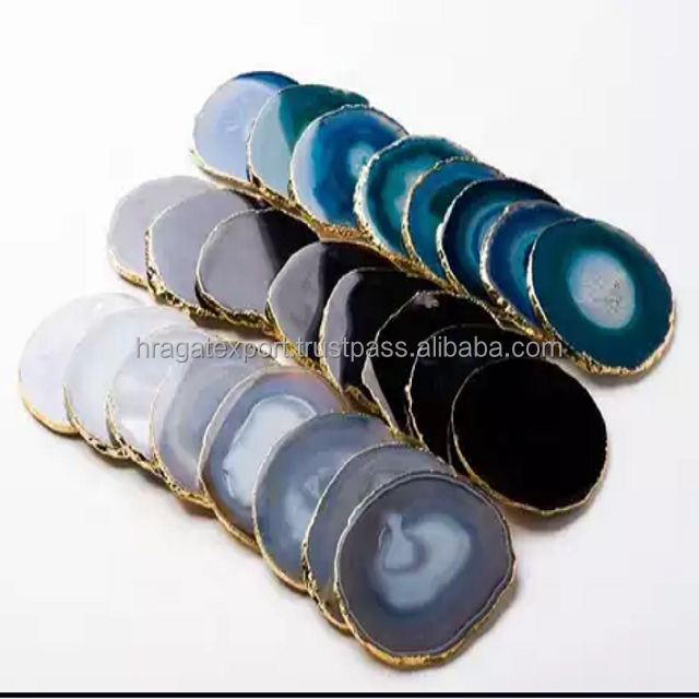 Agate Natural Stone Wholesale Best Quality Blue Onyx Healing Energy Golden Trim Coaster Crystal Electroplated Slice