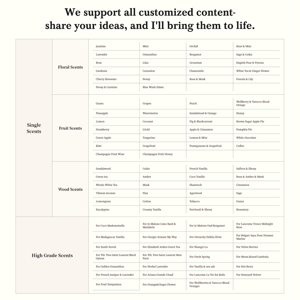 Fragrance Options:Custom scent, floral, woody, fruity, oriental