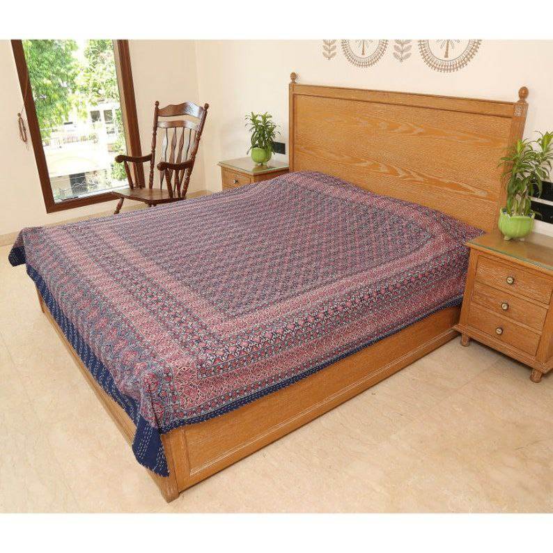 Ajrakh Kantha Quilts Handmade Stitched Block Print Bohemian Hippie Style Cotton Bedspread Throw Blanket for Home and Hotel Use