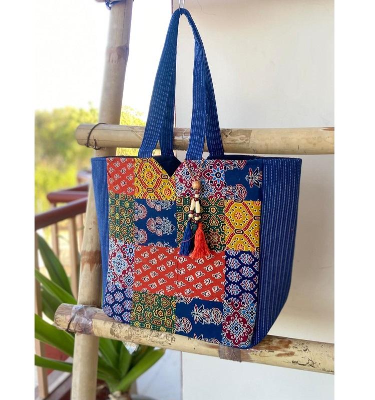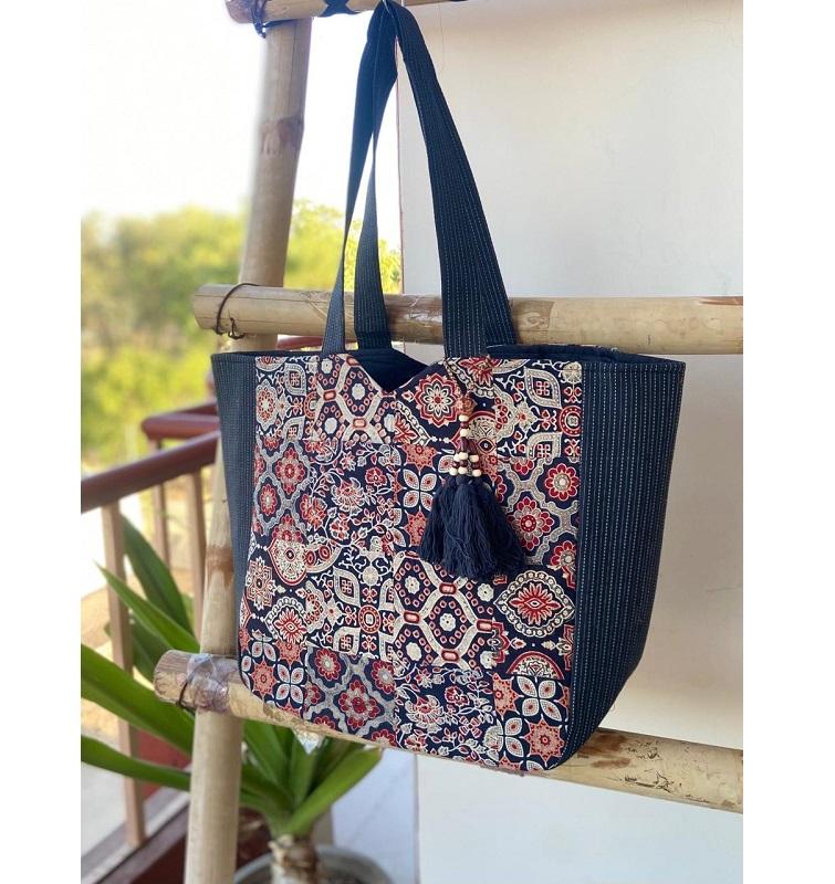 Ajrakh Printed Cotton Shopping Bag With Inside Pocket And Secure Zip Closure Perfect For Daily Use Gifting Size 13 x 13 x 7 Inch