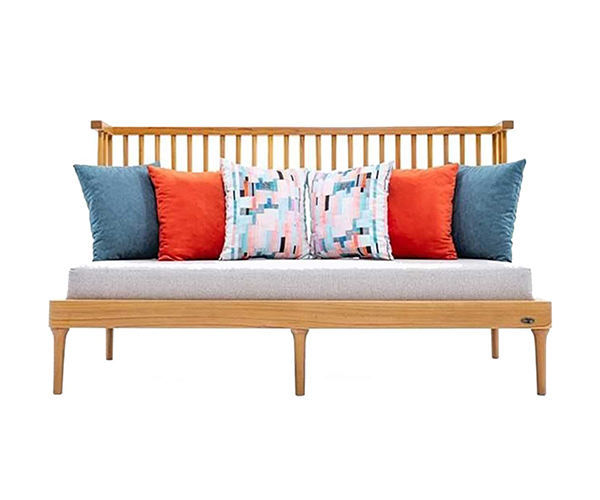 Description:solid wood lounge sofa and thick cushions with patterned fabric.