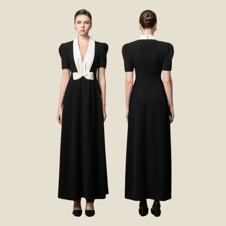 Akina Long Dress Captures Feminine Grace With Puff Sleeves Contrast Collar And Elegant Luxurious Fabric Texture