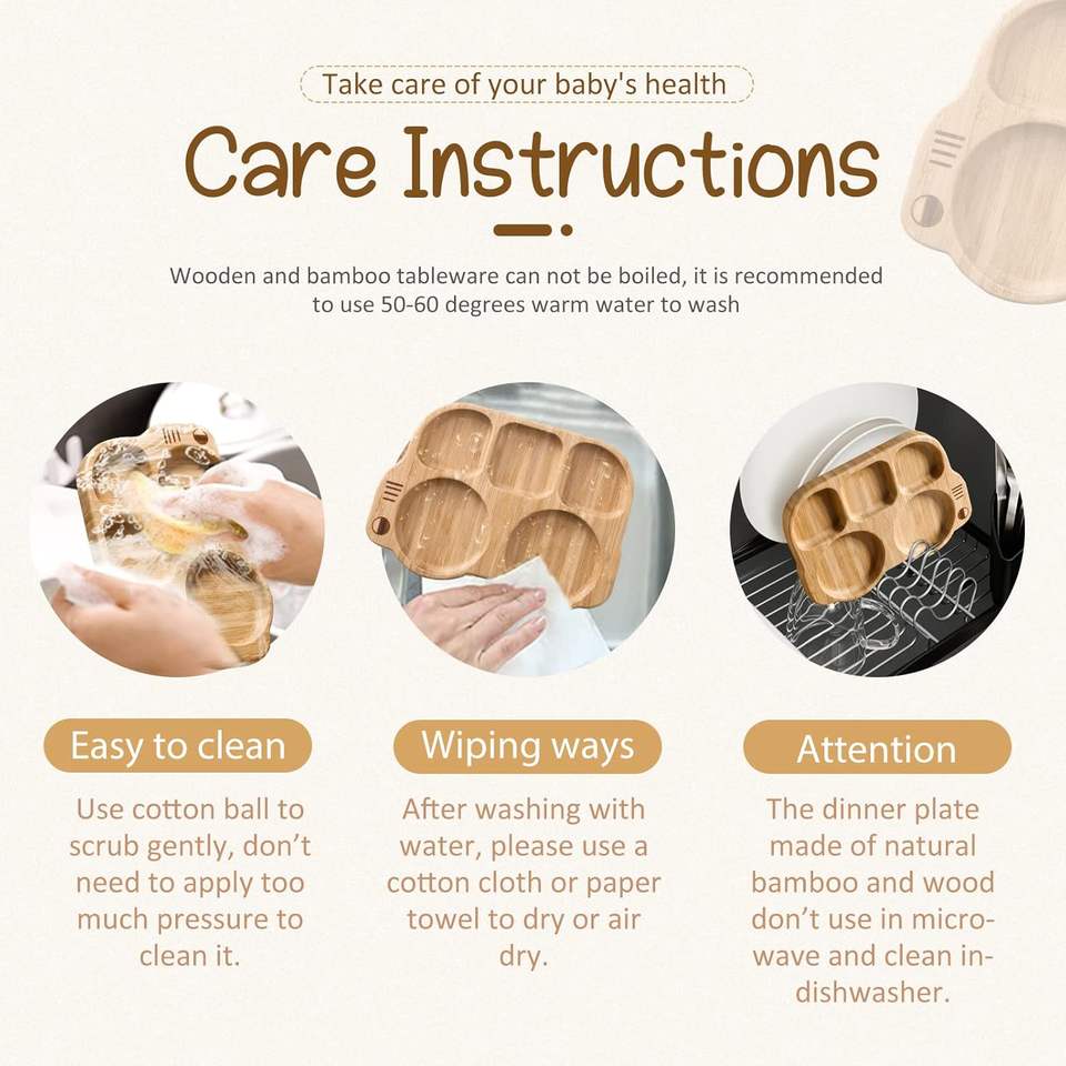 All-Natural Bamboo Divided Plate With Silicone Spoon Fork Non-Slip Baby-Led Weaning Dish Suction Plates for Toddler's Meal Time