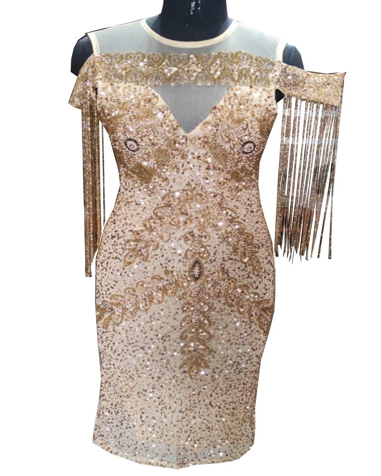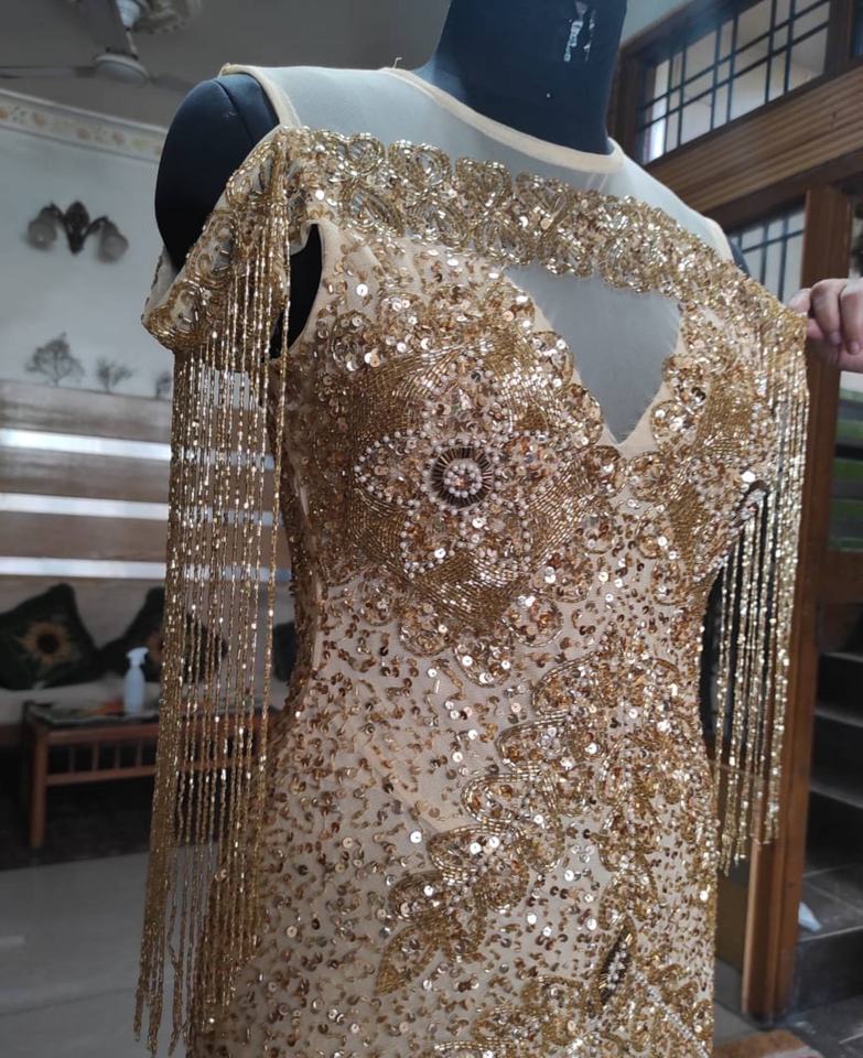 All Sizes Wholesale Customized Color Very Beautiful Hand Embroidered/ Hand Beaded Dazzling Golden Off-Shoulder Trumpet Dresses