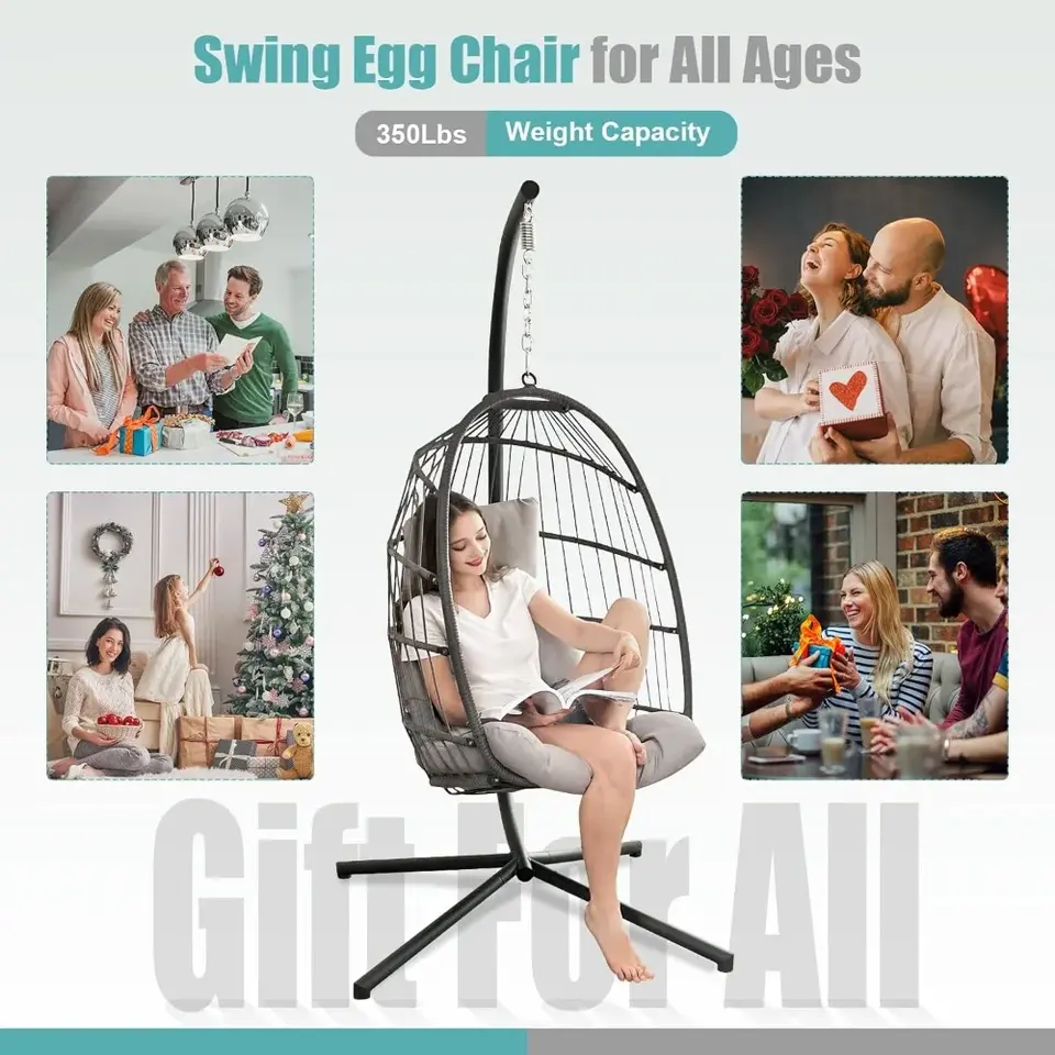 All Weather Swing Egg Chair Indoor Outdoor, Comfy Rattan Patio Basket Hanging Chair with Stand and Cushions, 350lbs Heavy Duty