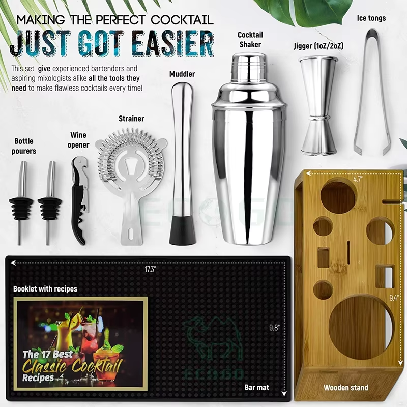All-in-One Premium Bartender Kit 11 Stainless Steel Tools Cocktail Shaker Wooden Stand Mat Effortless Mixing