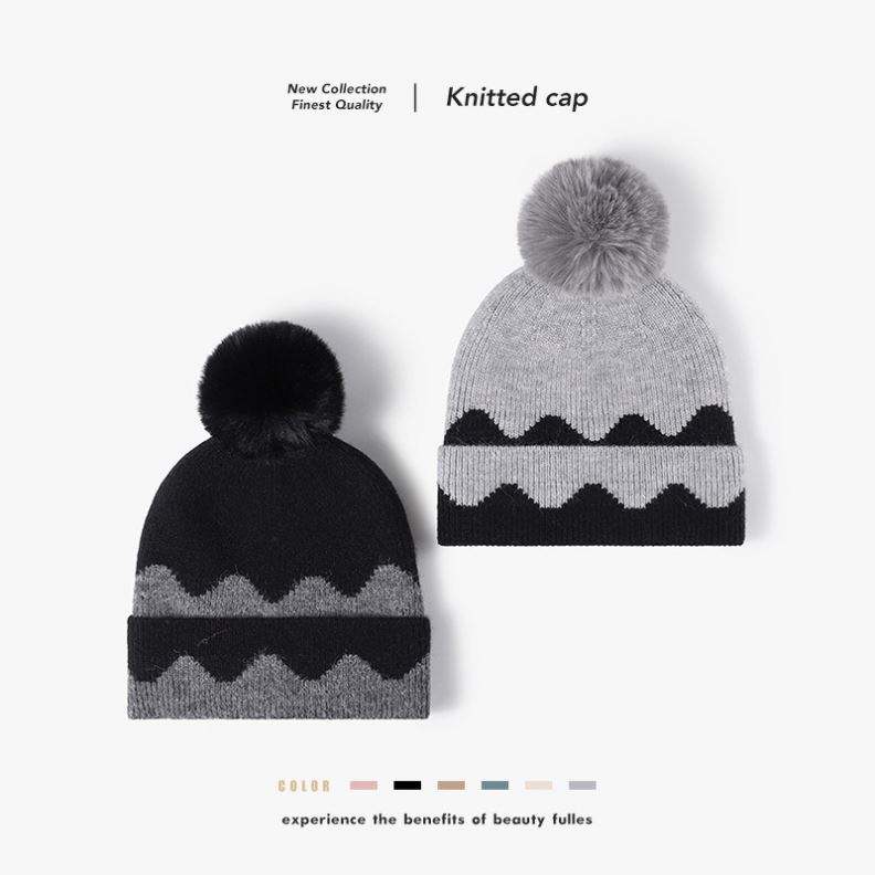 All-matching Warm with Velvet extra Thick Band Fur Ball Women's Color Matching Woolen Cap Fashion Simple Knitted Hat