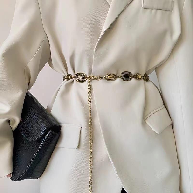 Handmade Vintage Alloy Beaded Belt for Long Dresses Carved Waist Cinching Waist Chain with Tassel for Suit