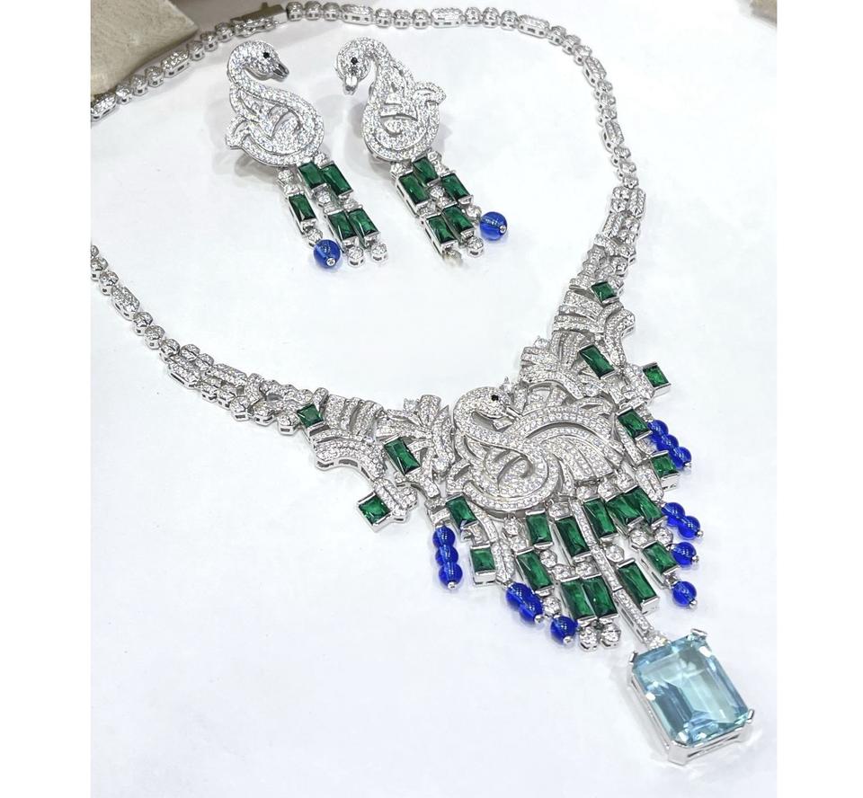 Alluring Long Silver Plated Statement CZ Necklace and Earrings Set for Indian Wedding and Party Wear Women