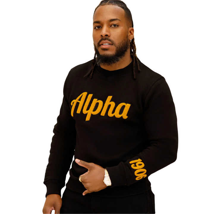 Alpha Year Sleeve Chenille Sweatshirt Custom Greek Apparel Black Gold Letters Embroidered Fraternity Pullover Wholesale