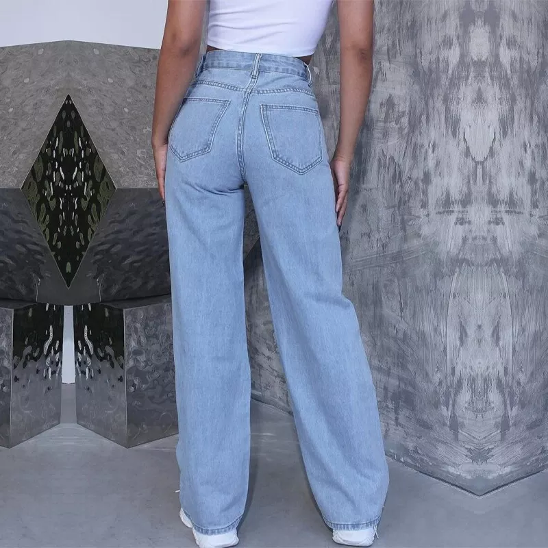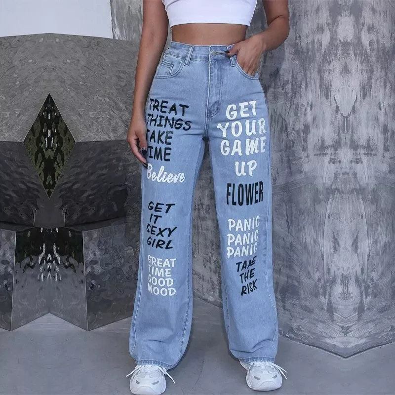 Alphabet Appliques Blue Straight Legging High Waist Zipper Fly Ladies Jeans