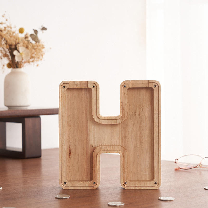 Alphabet Shape Wooden Money Saving Box with Transparent Acrylic Front for Kids and Adults