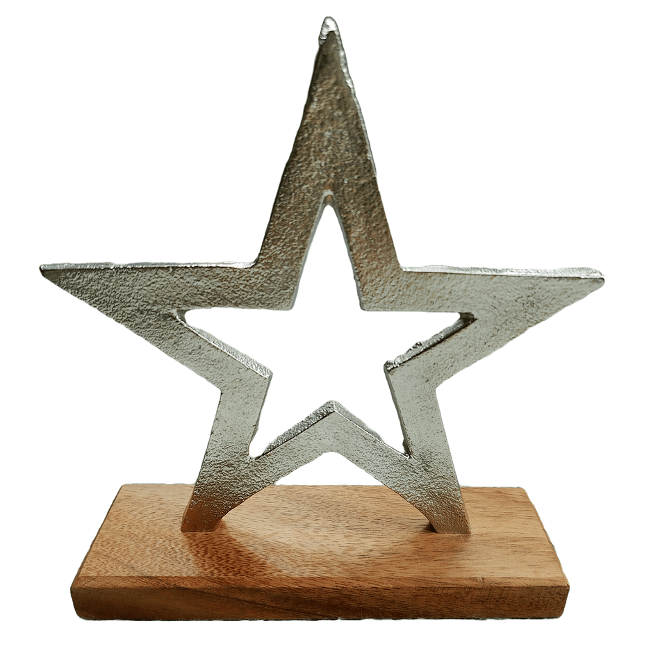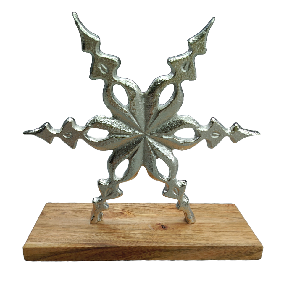 Aluminium Snowflake Ornament Premium Silver Tabletop Decor With Wooden Base Handcrafted Christmas Decorative