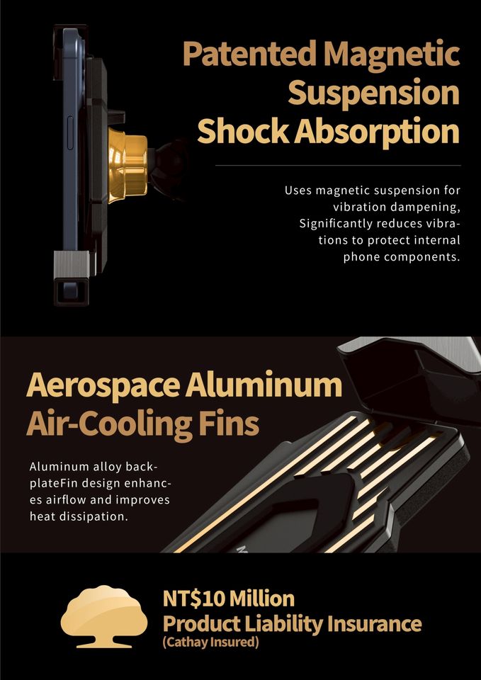 Magnetic suspension shock-absorbing design, One-second attachment and removal, Full-cover silicone, Safety locking button, Simple anti-theft designFeature