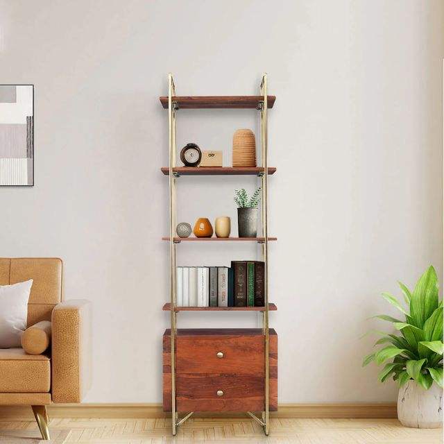 Alviya Modern Contemporary Design Sheesham Wood Study Room Bookcase Natural & Gold Finish