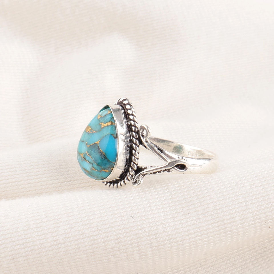 Amazing Design Blue Copper Turquoise Ring 10x14mm Pear Shape 925 Sterling Silver Handmade Bohemian Statement Womans Jewelry Gift