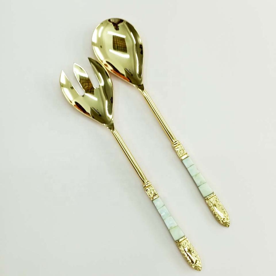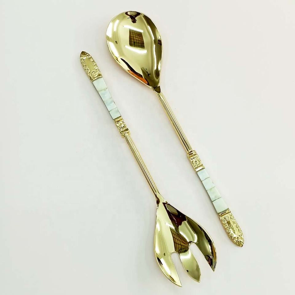 Amazing Gold Stainless Steel Spoon and Fork Salad Servers Elegant MOP & Embossed Design End Handles Cutlery Salad Server Set