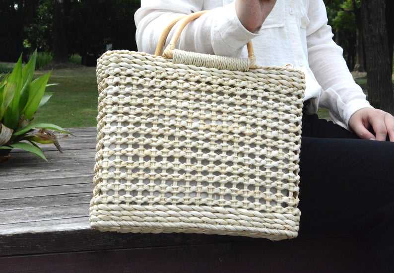 Amazon Eco Friendly White Woven Cross Body Bag Water Hyacinth Straw Handbag Women Beach Bag Summer Tote Bag Handmade by Vietnam