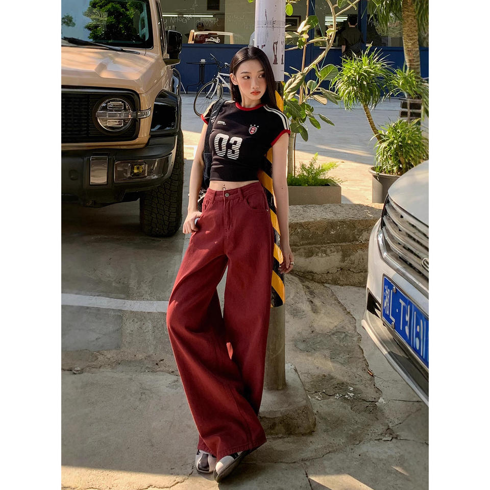 American Ankola 2025 Early Spring New High Waist Straight Loose Narrow Version Cotton Denim Medium Thickness Jeans for Women Red