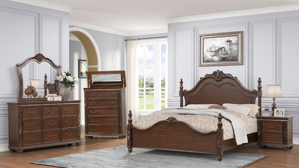 American Classic Dark Brown Carved Bedroom Furniture Set - Poster Bed Dresser Nightstand Chest for Luxury Vintage Home Decor