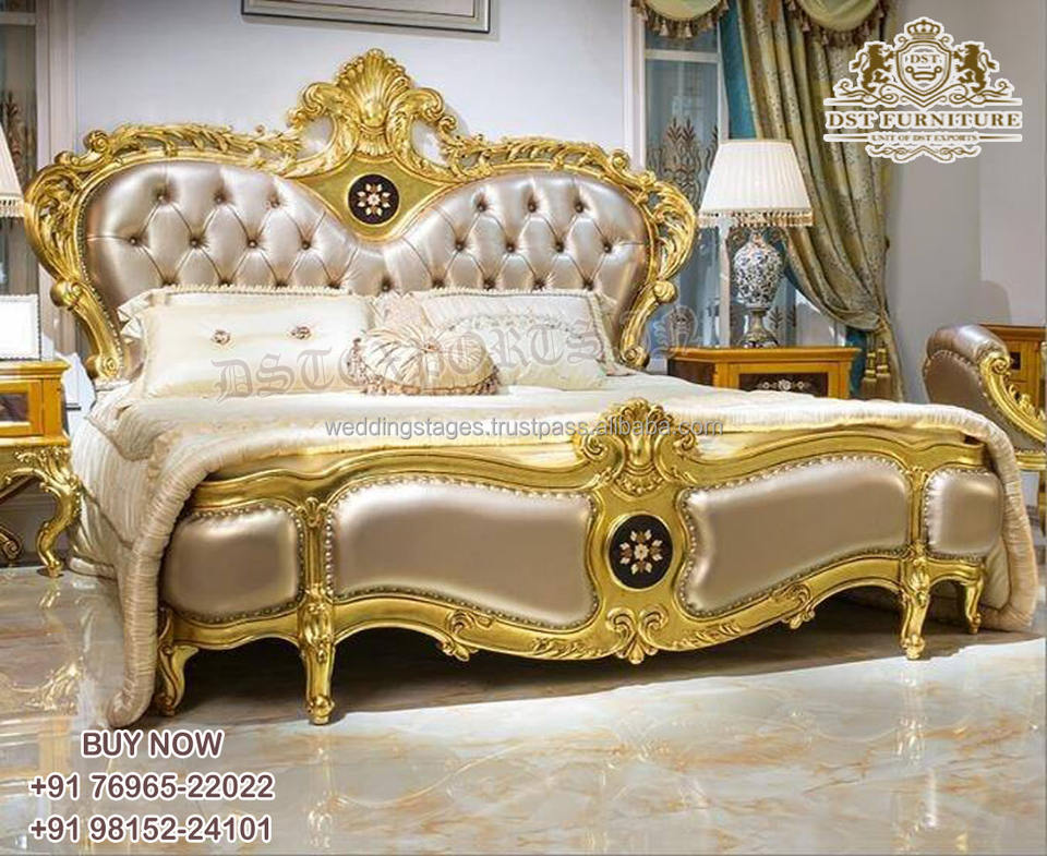 American Design Handcrafted Teak Wood Queen Bed with Side Stools Modern Bedroom Furniture Hand Carved