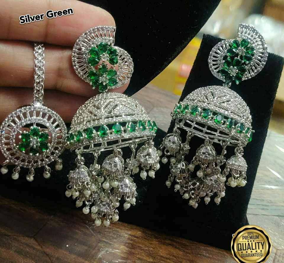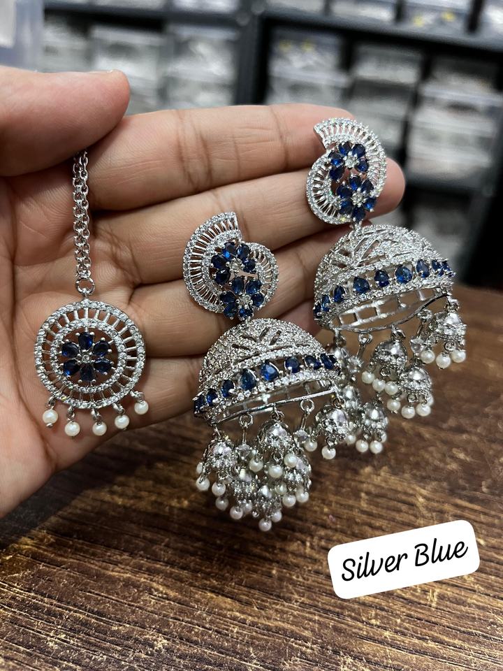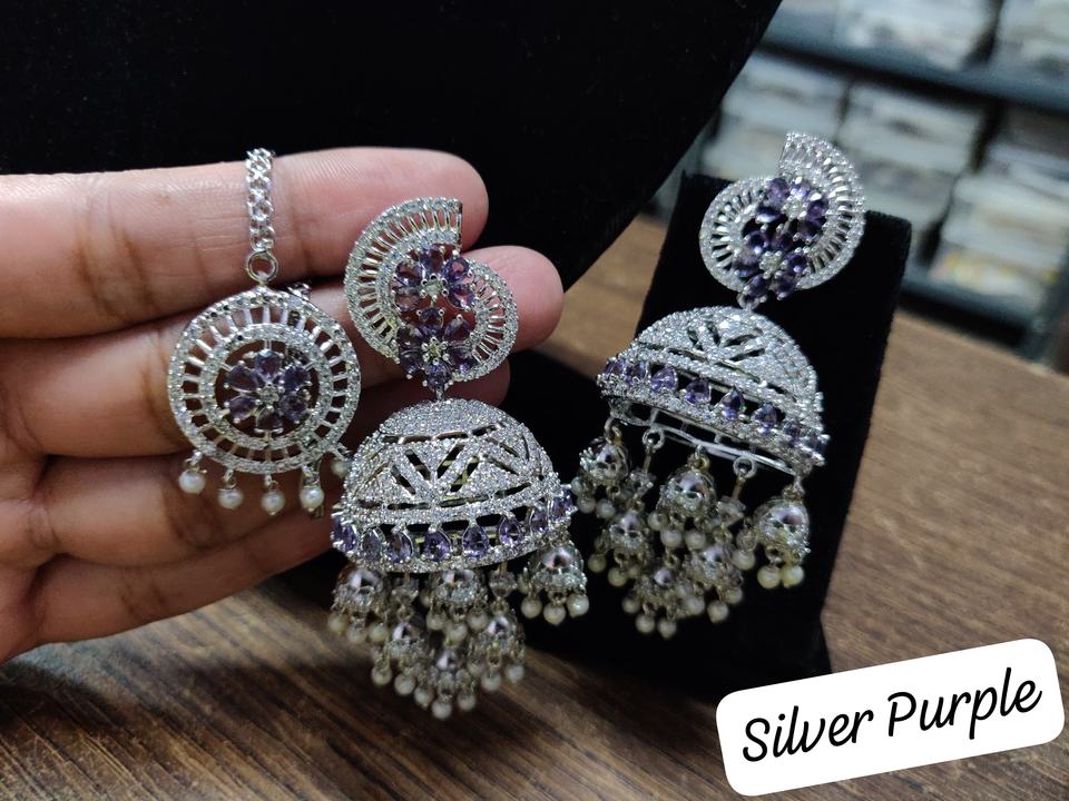 American Diamond Jhumki with Maang Tikka Bridal Earrings Set for Women Traditional Party Wear Jewelry Silver Rose Pink Jhumkas