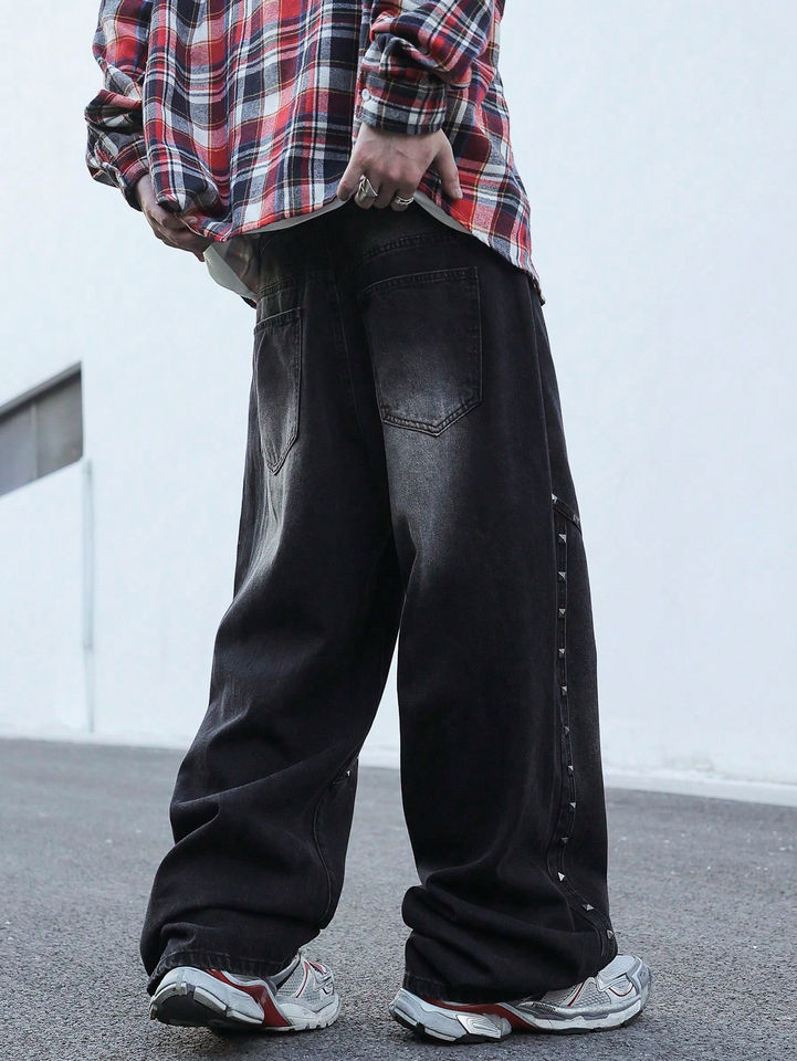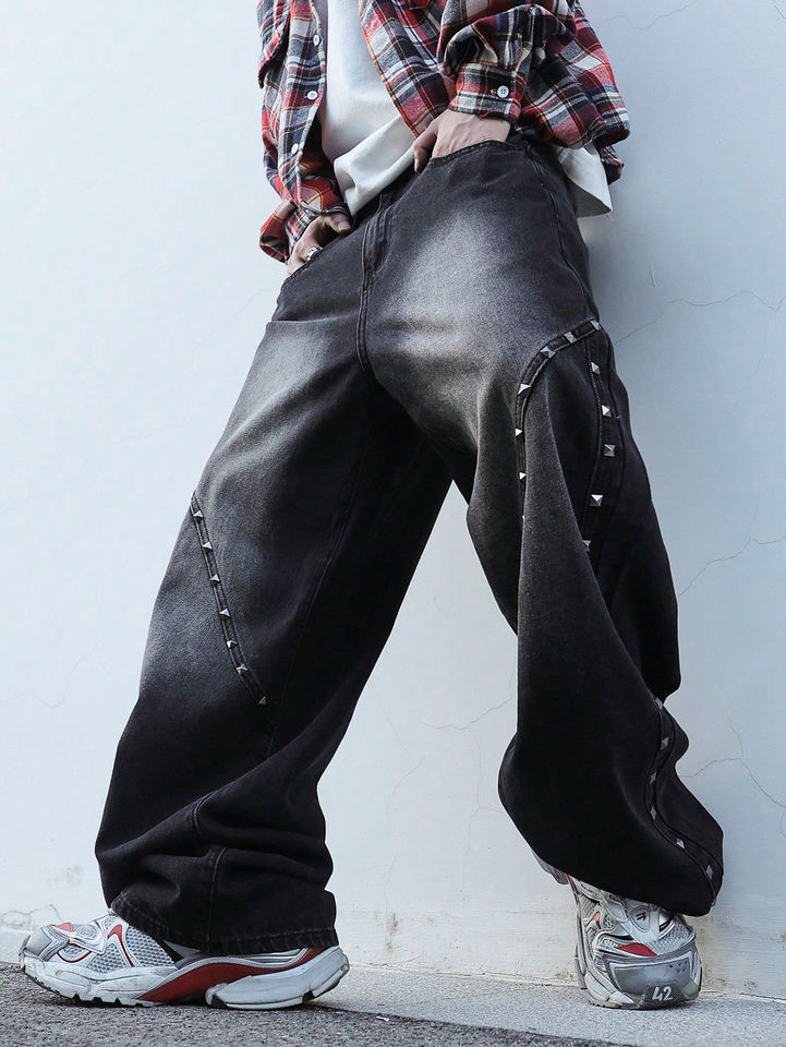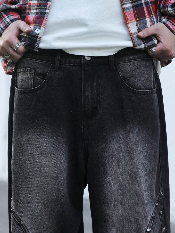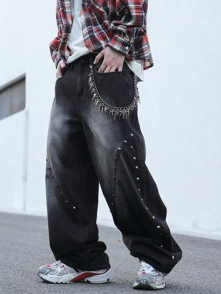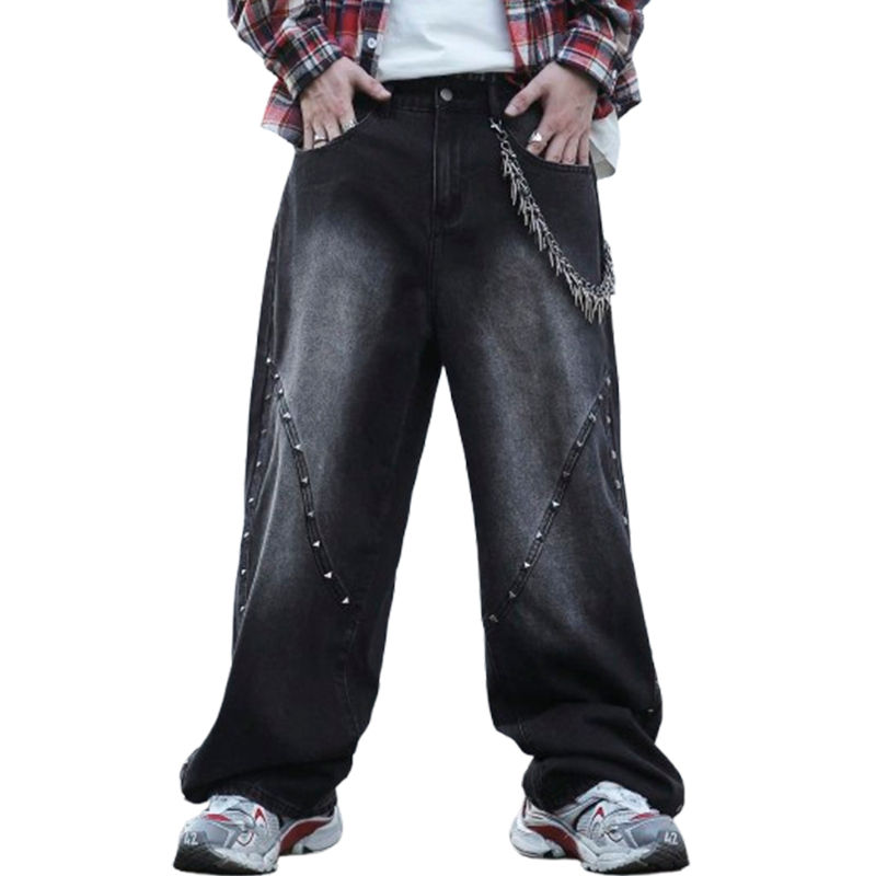American Fashion Brand High Street Men's Jeans High Quality Straight Tube Loose Washed Heavy-Duty Design Chain Nail Plus Size