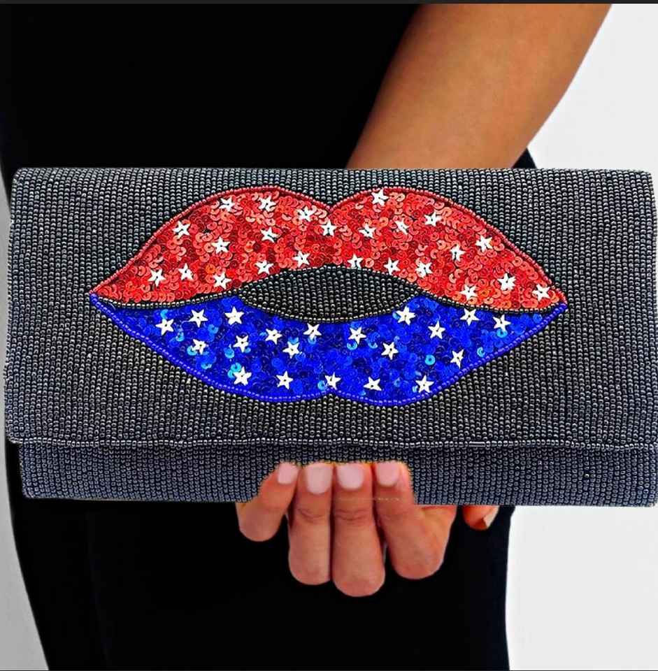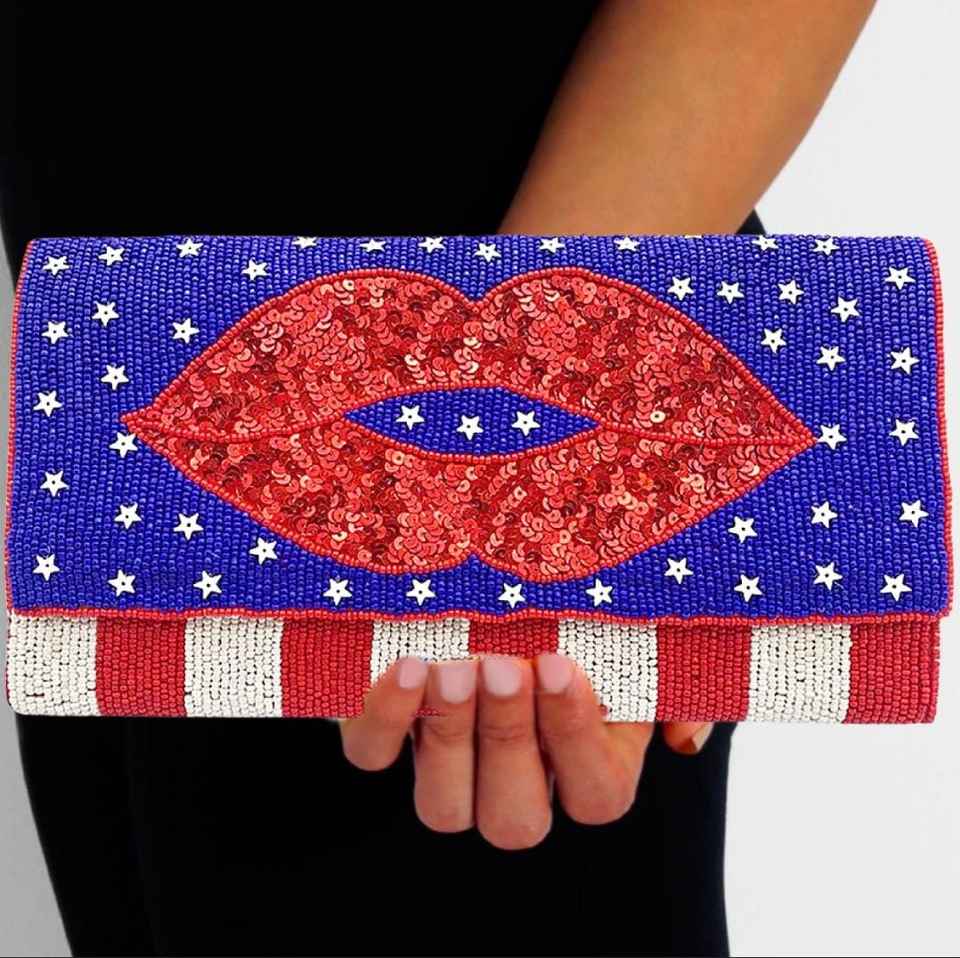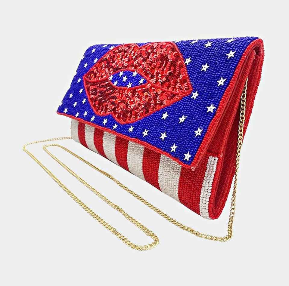 American Kiss USA Luxury Chain Clutch Handbag Sequin Lips Patriotic Flag Seed Beaded Crossbody Style for Evening Events