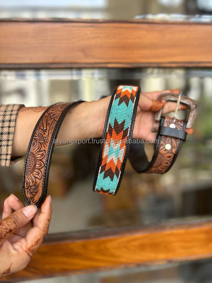 American Leather Cowboy Designer Beaded Belt Men's Gift Western Fashion Bling Luxury Belt Premium Cow Hide Floral Hand Tooled