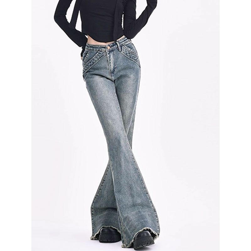 American Retro Design Women's Low Waist Elastic Jeans with Mop Stitching Bow Decoration Raw Edge Flared Style for Spring Summer