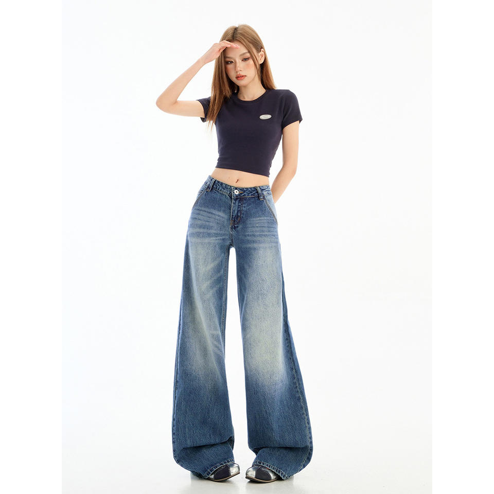 American Retro High Waist Boot Cut Light Blue Cotton Jeans for Women Versatile Loose Wide Leg Petite Pear Shape Trousers